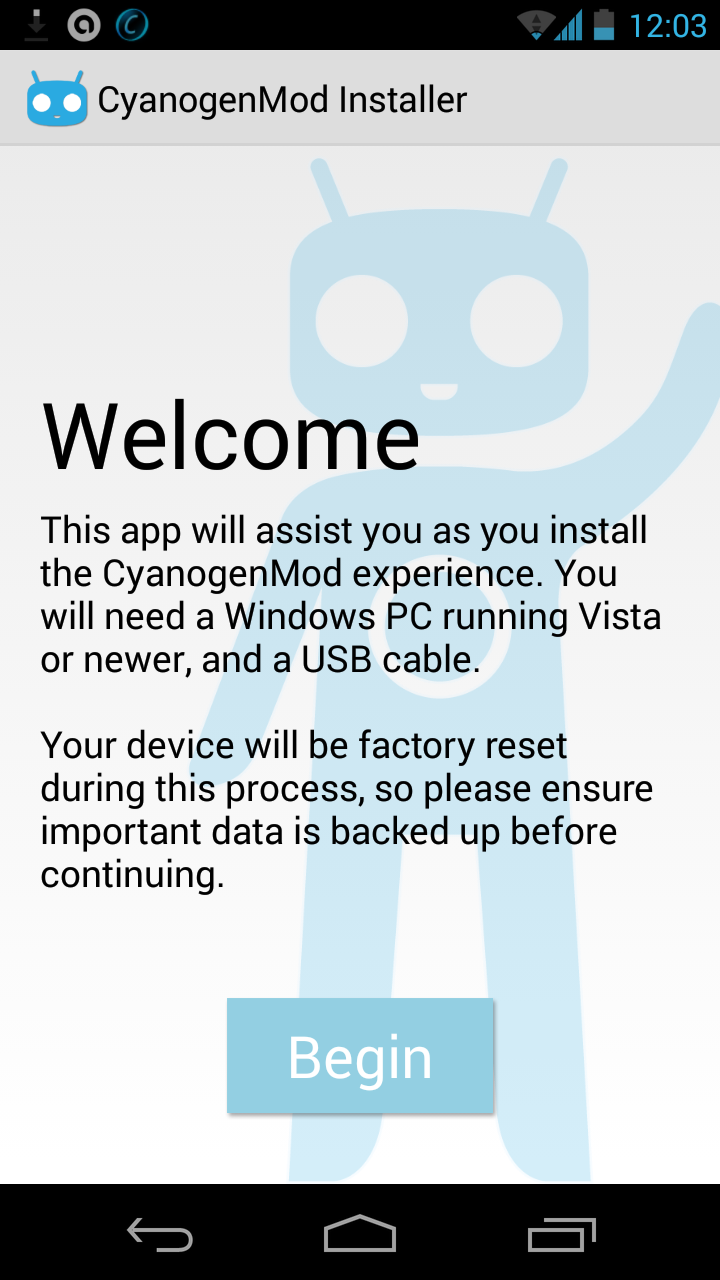 మొదట సైనోజెన్మోడ్ ఇన్స్టాలర్ ఆప్ ని ఇక్కడ నుండి దింపుకుని మన ఫోన్లో ఇన్స్టాల్ చేసుకోవాలి.